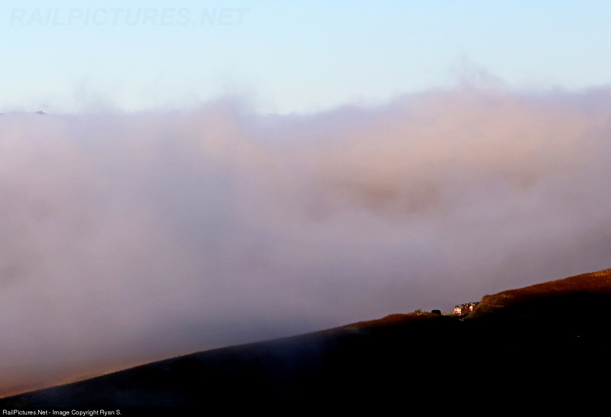With the thick marine layer still shrouding Chorro and the San Luis Obispo Valley UP 7619 peaks around the curve leading to the 'little horseshoe', catching the first rays of the morning.