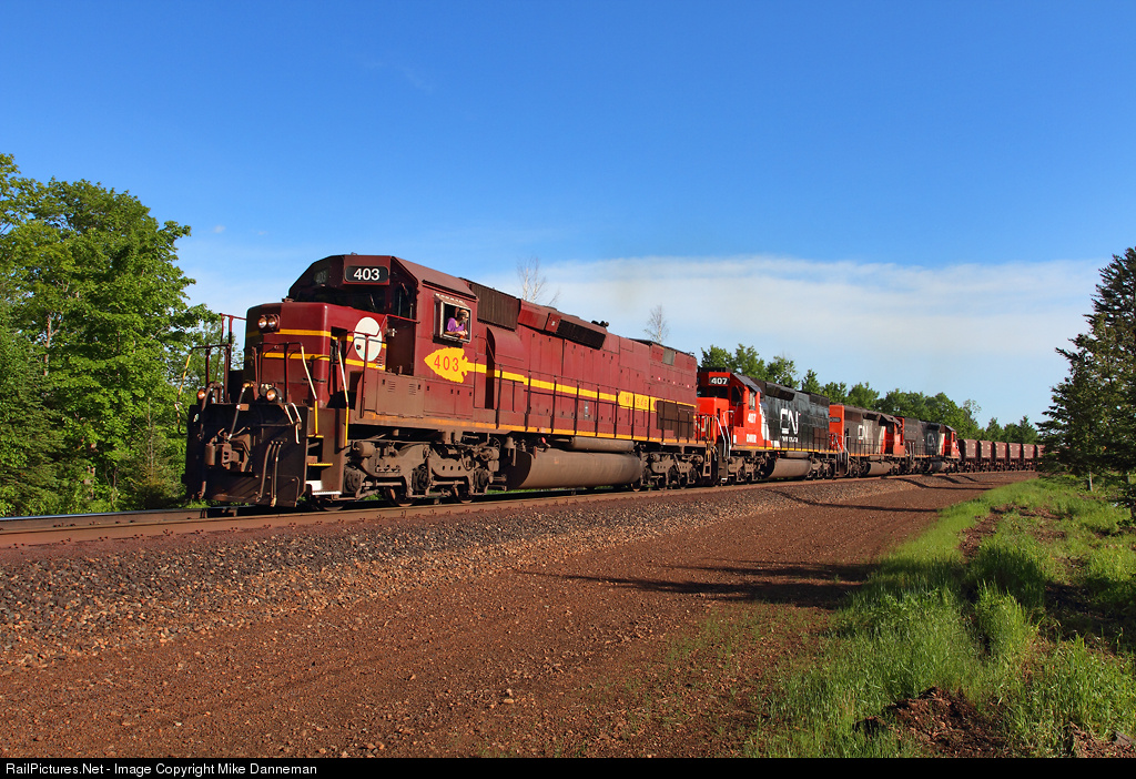 Duluth, Missabe & Iron Range “heritage” SD40-3 No. 403 leads a Canadian National taconite ore empty as it hustles past milepost 6 north of Waldo not long after climbing the hill out of Two Harbors, Minnesota, on the afternoon of June 10, 2016. The conductor looks back over the train at a couple of other photographers at the Big Rock Road grade crossing.