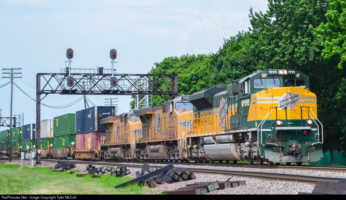 On a rather cloudy day, the sun breaks through the clouds just as UP 1995 comes flying around the corner and passes under the CNW signal bridge that is due to fall soon. We have the CNW heritage unit passing under a signal bridge to the railroad that it honors!