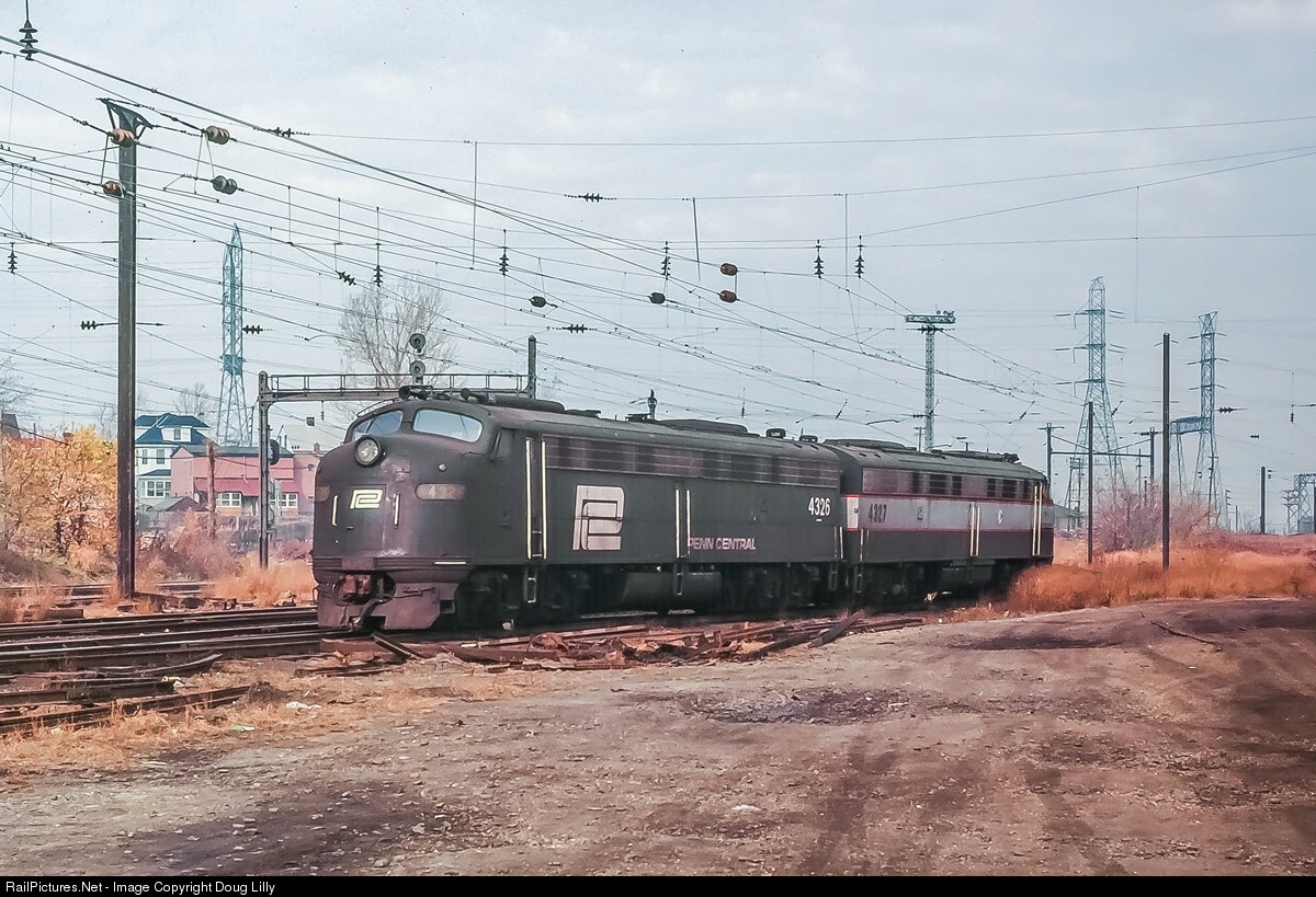 Consecutively numbered E8’s thread their way through the engine terminal leads at South Amboy, New Jersey. While noted for being the home of the last operating GG1’s, the non-electrified territory south of South Amboy was known by railfans for decades as the place where outmoded passenger locomotives were sent to run out their last miles. By the mid-1970’s E7’s had given way to E8’s. Before the E7’s, the PRR banished their Alco PA’s and Baldwin passenger sharks to the New York & Long Branch, succeeding classic K4s Pacifics that had made their last stand along the Jersey shore. Here the first unit is in former owner Penn Central’s paint, while the trailing E8 is painted for the New Jersey Department of Transportation.