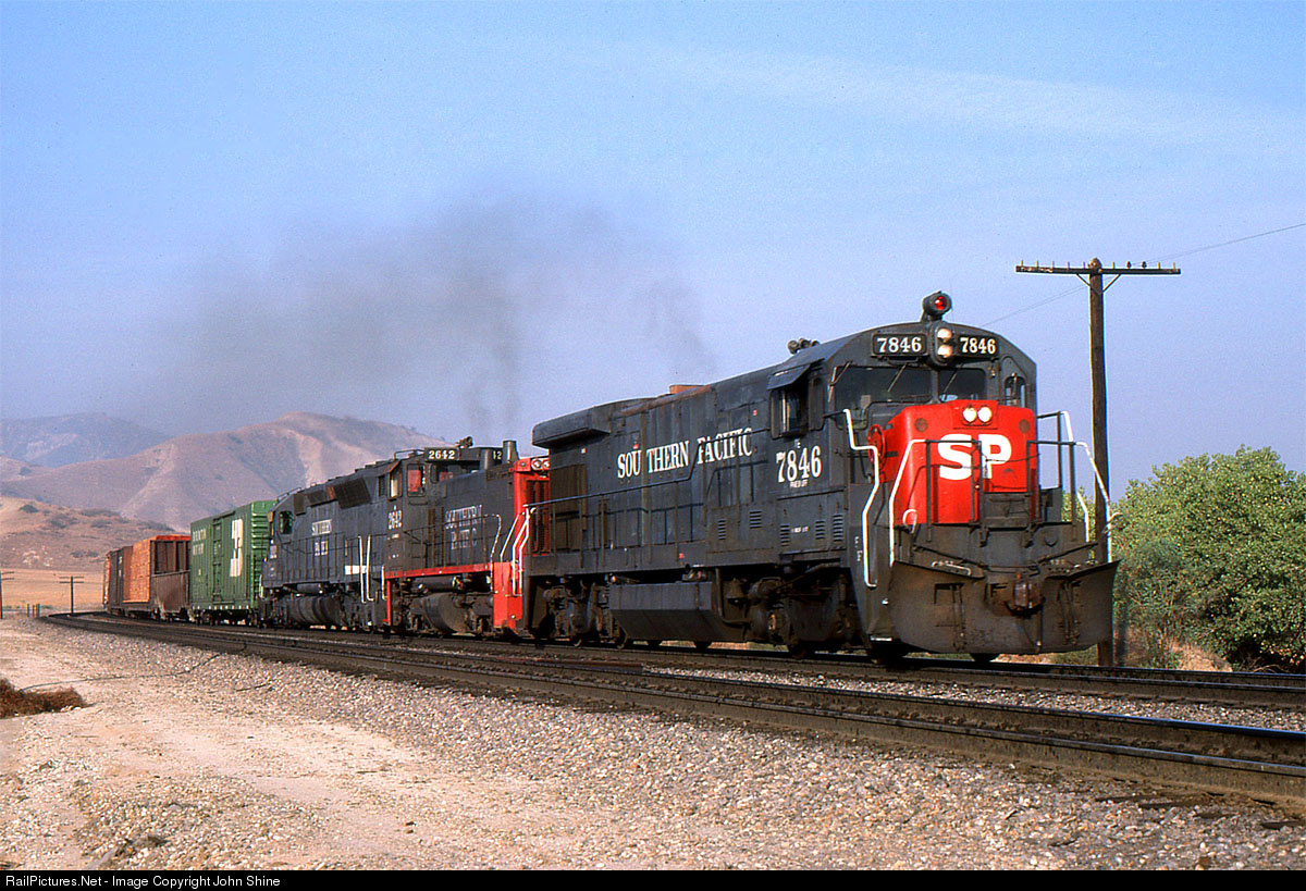 | The Eastbound Niland turn works up Beaumont Hill with the interesting consist of B30-7 7846, SW1500 2642 and SDP45 3202! Only on the late, great SP:} |