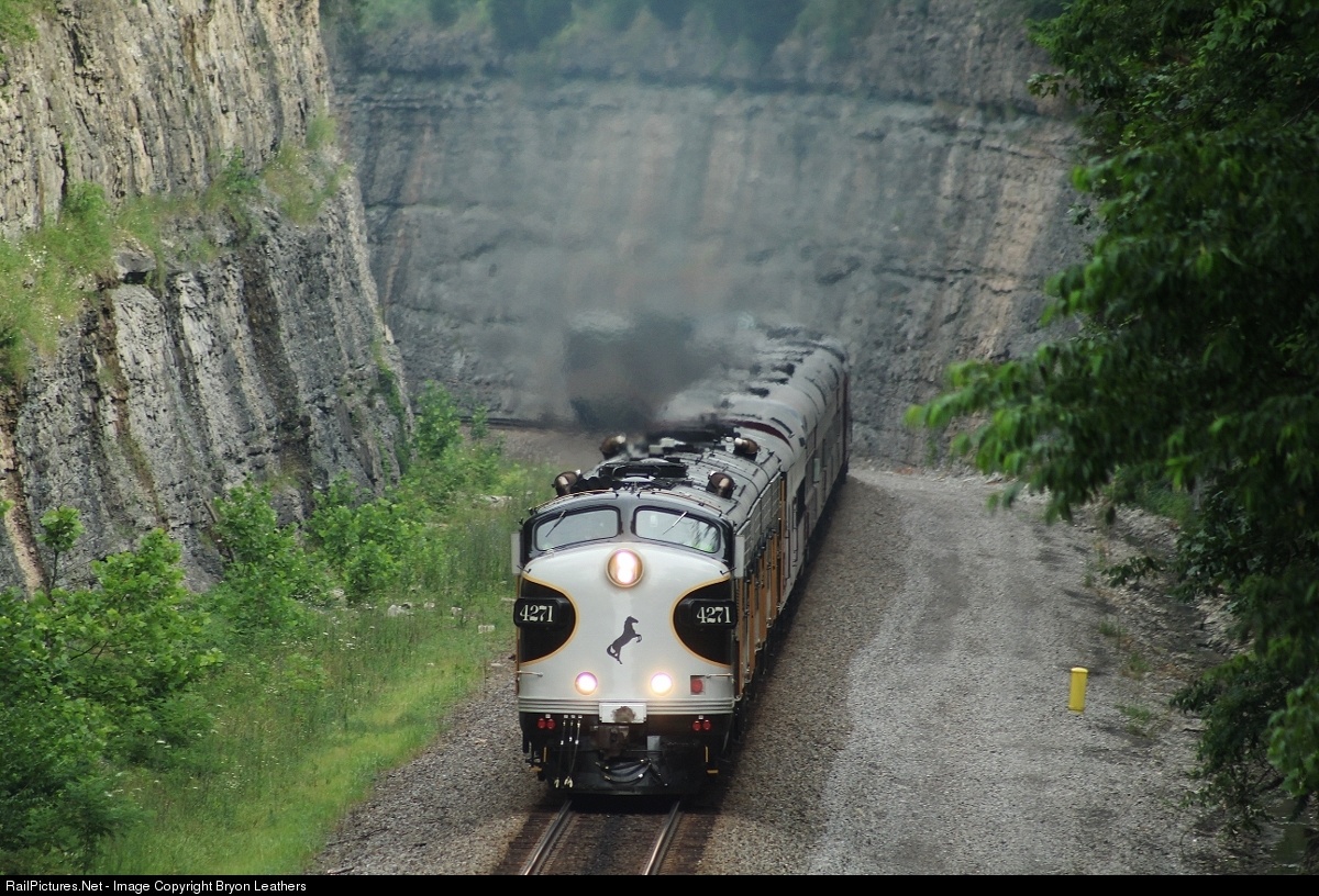 NS 951, the Norfolk Southern executive train is keeping a steady pace under the power of 4 veteran EMD F units. While not their first trip on the CNO&TP, they also aren't the first cab units to run the line. Before NS, Southern Railway's first generation diesels stampeded this section of the CNO&TP better known as "The Rathole". Before the cut pictured here at Kings Mountain came to existance, the line had undergone a massive renovation in 1963, blasting around most of the tunnels with the exception of 2 in which The Rathole got it's name, 1 of the original tunnels rests just to the left of this picture.