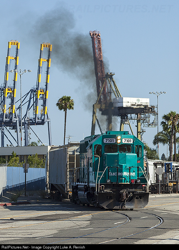 EMDX 7101, the GP22ECO demonstrator, shoves a cut of borax cars from the facility in Boron, CA into US Borax, deep in the Port of Los Angeles. Engine is ex KCS exx CR originally PC GP40 3173.