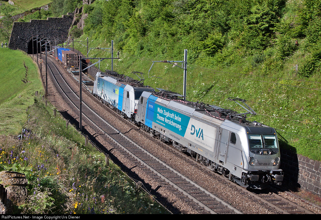 | 187 008 (with publicity paint scheme for DVA insurance) and 186 109, both leased from Railpool, with a northbound intermodal train on the Gotthard north ramp. |