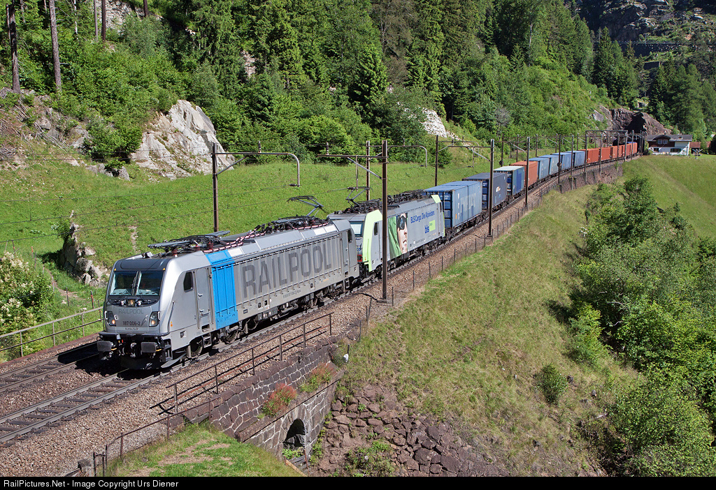 | 187 008, leased from Railpool, and Re 486 505 with a southbound intermodal train on the Gotthard north ramp. |