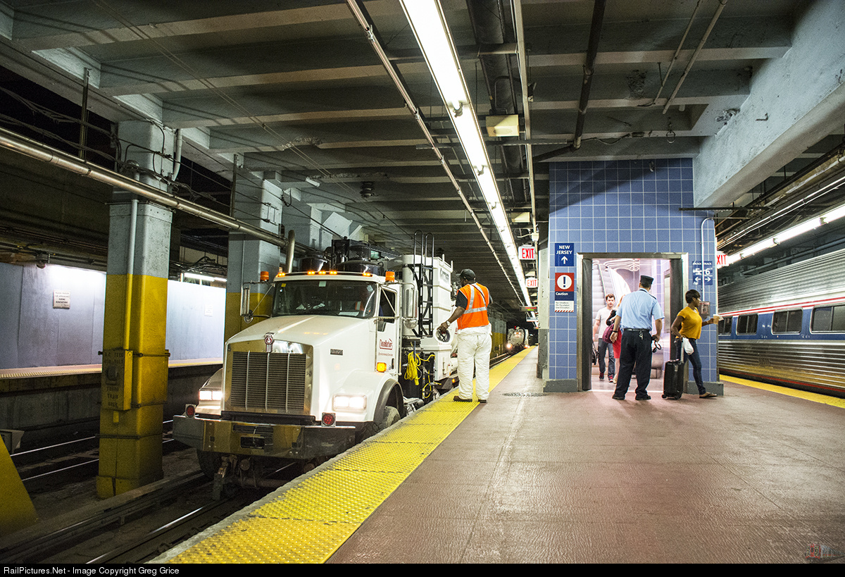 "Guzzler Vac Truck @ NYP" One of two hi-rail equipped Kenworth Guzzler Vac Trucks sits on Track 5 at Amtrak's Penn Station. The crews are waiting for the last Empire Service train across the platform, #245, to depart from before beginning the all night process of ridding the tracks of PCBs, or polychlorinated biphenyls. Elevated amounts of the cancer-causing toxins were original found in about an inch of sediment on two tracks, but as a safety measure, all tracks in Penn Station are being retested and cleaned. The source of the contamination is said to have originated from locomotive fluids that trains during the days of the Pennsylvania Railroad used to normally operate.