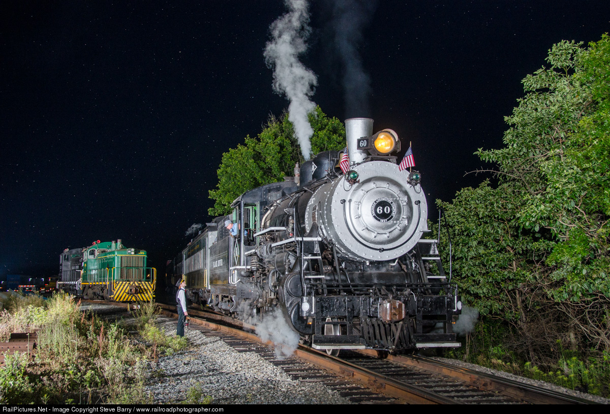 | Black River & Western's ex-Great Western 2-8-0 No. 60 poses with former Erie Railroad SW9 No. 438 during a night photo session sponsored by the Volunteer Railroaders Association. |