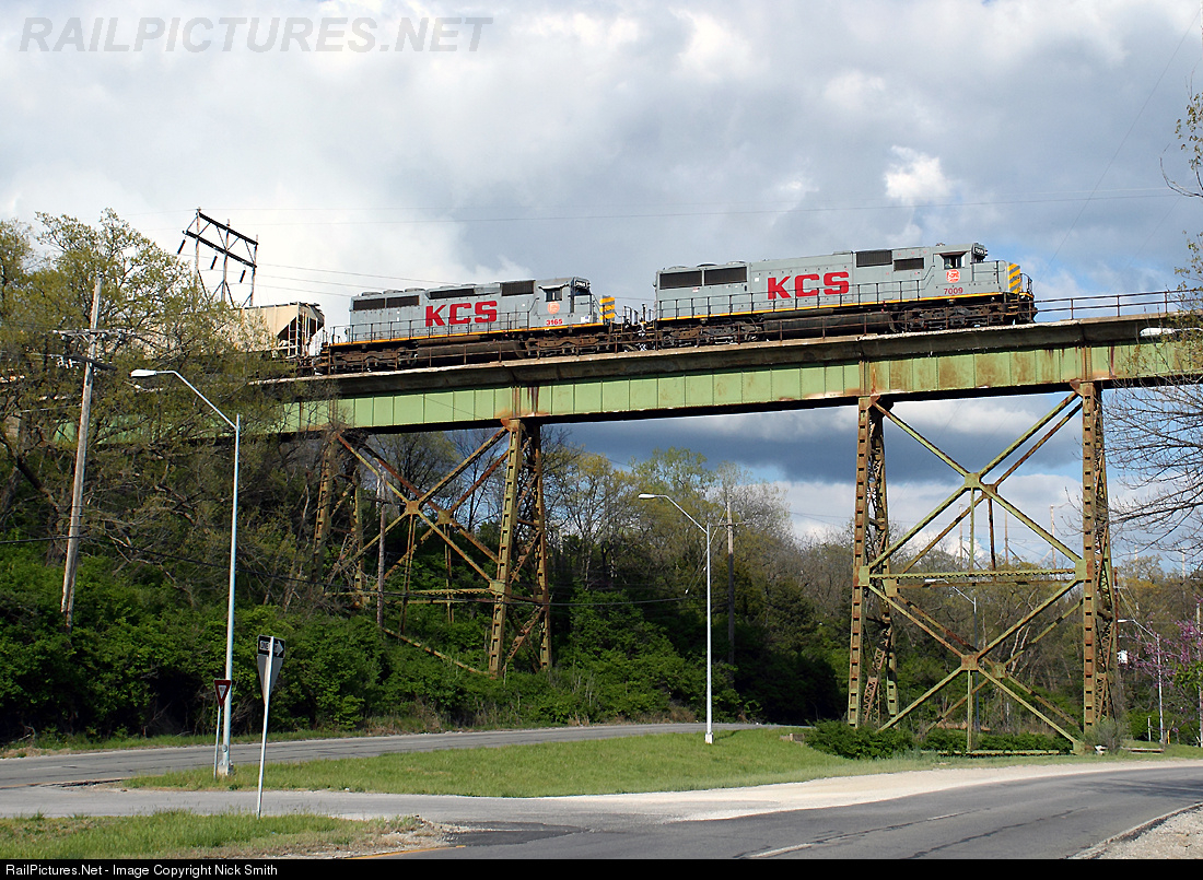 | KCS 7009 and 3165 lead a scorpion train south out of KC on the KCS Pittsburg Sub. After a crew change at Blue Valley, the train is highballing for Pittsburg, KS. KCS 7009 is an ex-Conrail SD50 picked up by the KCS in the 2000's. KCS 3165 is an original KCS SD40 built in 1971 as KCS 633. |