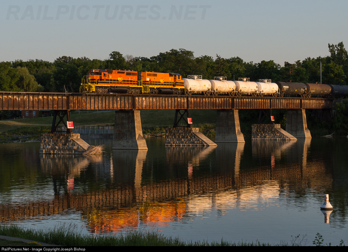 RLHH 3404 leads train 597 across the Grand River in Caledonia under the last light of the evening.