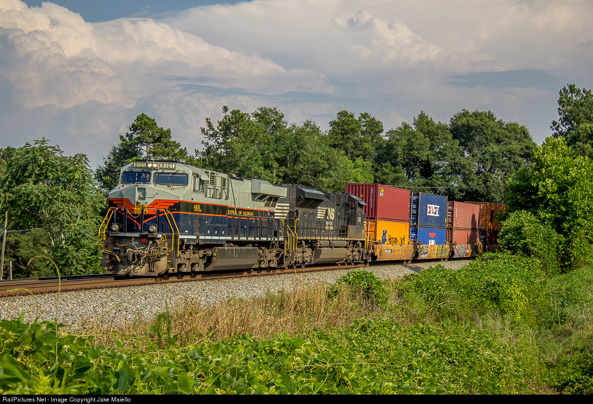On a hot summer evening, Norfolk Southern's Central of Georgia heritage unit could be seen leading intermodal 238 on its way to Charleston, South Carolina. The spiffy GE and its train are seen here at Red Lane, on the Greenville District, twisting through the curves and the Georgia kudzu.