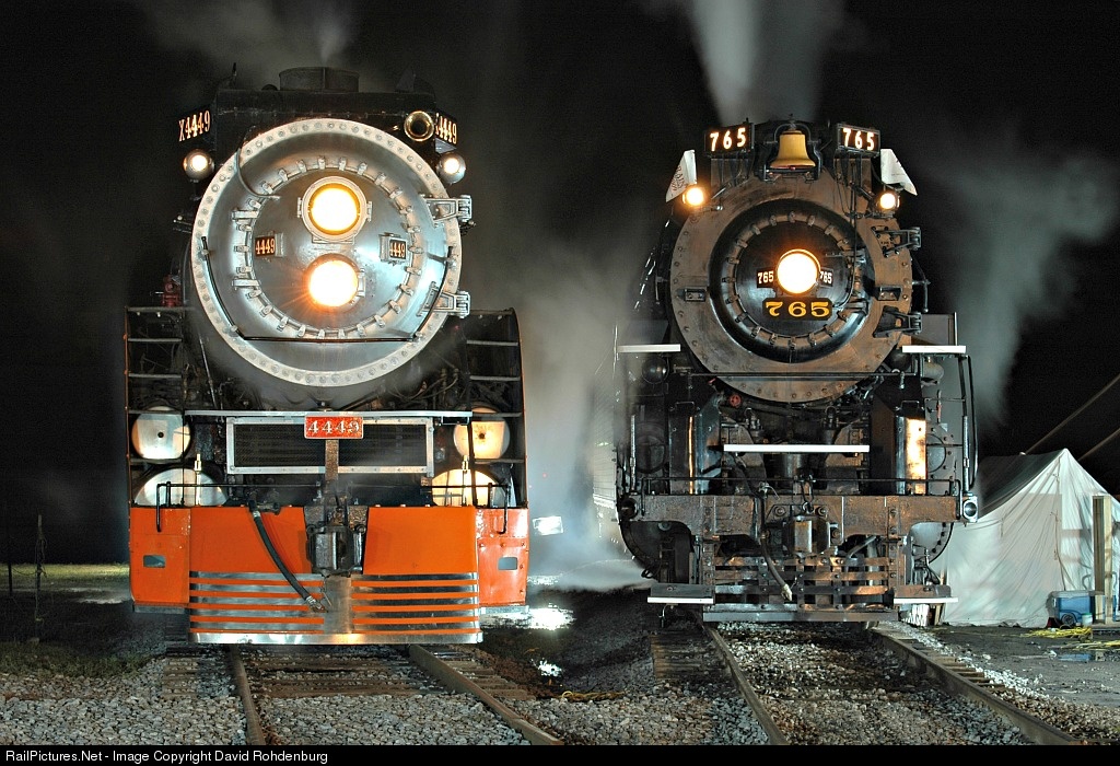 | A pair of Lima Locomotive Works' finest products, NKP 765 and SP 4449, simmer around the turntable at the Steam Railroading Institute during a night photo session for Train Festival 2009. |