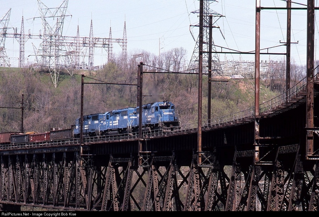 Conrail's Pittsburgh to Morrisville manifest freight is crossing the massive 1904-built bridge over the Conestoga River. The bridge was an integral part of the PRR's Atglen & Susquehanna Branch; the double-tracked line was electrified in 1937 and the trolley wires were removed in the mid-1980s. The last train crossed the bridge December 19, 1988, and the tracks were removed in 1990. Rail trails exist at both ends of the now-closed structure, and it's hoped that the bridge can be restored for pedestrian and bike traffic in the near future. Lead locomotive No. 6376 was built by EMD for Conrail in July, 1977 and was renumbered by NS as its 3341.