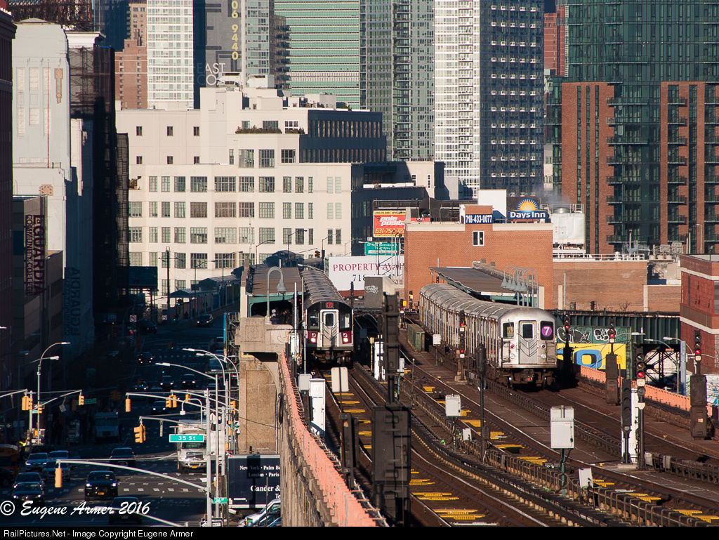 Due to the CBTC (Communications-Based Train Control) project currently underway on the No.7 Flushing line, the R62A's are fast disappearing as they are moved to the No.6 Lexington Avenue line and replaced on the 7 by R188's. On a crisp and sunny February morning in a scene symbolic of the changeover, a Manhattan-bound train of R62A cars is arriving at the 33rd Street station, while a train of R188's is stopped at the opposite platform, heading towards Flushing-Main Street.