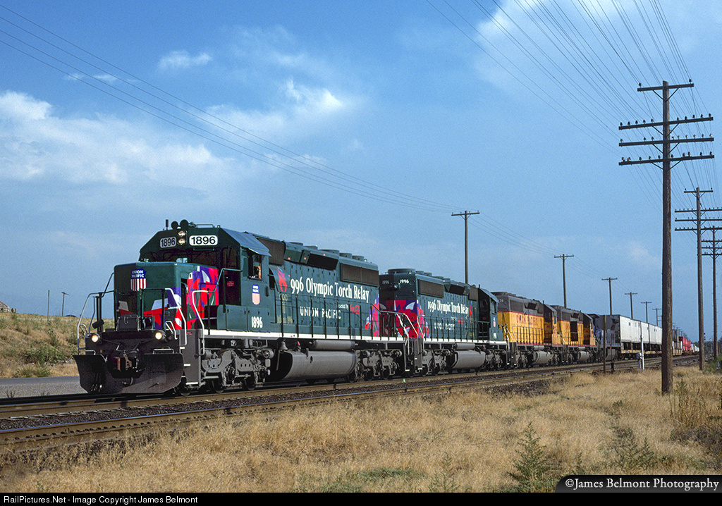 Union Pacific SD40-2s 1896 and 1996, painted to celebrate the 1996 Olympic Summer Games in Atlanta, Georgia, lead a priority intermodal train out of Salt Lake City on Aug. 2, 1996.