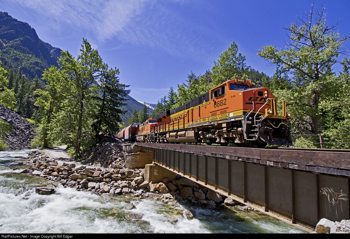 | BNSF 6882 descends Stevens Pass at MP 1694 with a J train, made up of exclusively empty Boeing aircraft equipment. The railroad follows Nason Creek east from the east portal of the Cascade Tunnel for about 10-12 miles before taking the Chumstick cutoff down to Leavenworth and the Wenatvhee River valley. |