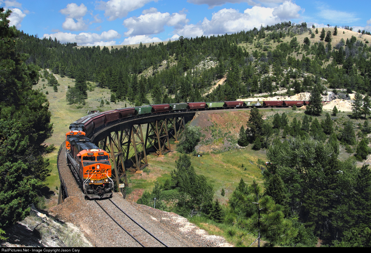 A westbound BNSF grain train marches across Greenhorn trestle in Run-8. Four MRL SD70ACEs are cut into the train 2/3 back, while a lone DPU pusher shoulders into the rear.... I liked the "heritage" Burlington Northern grainers, they added a splash of color...