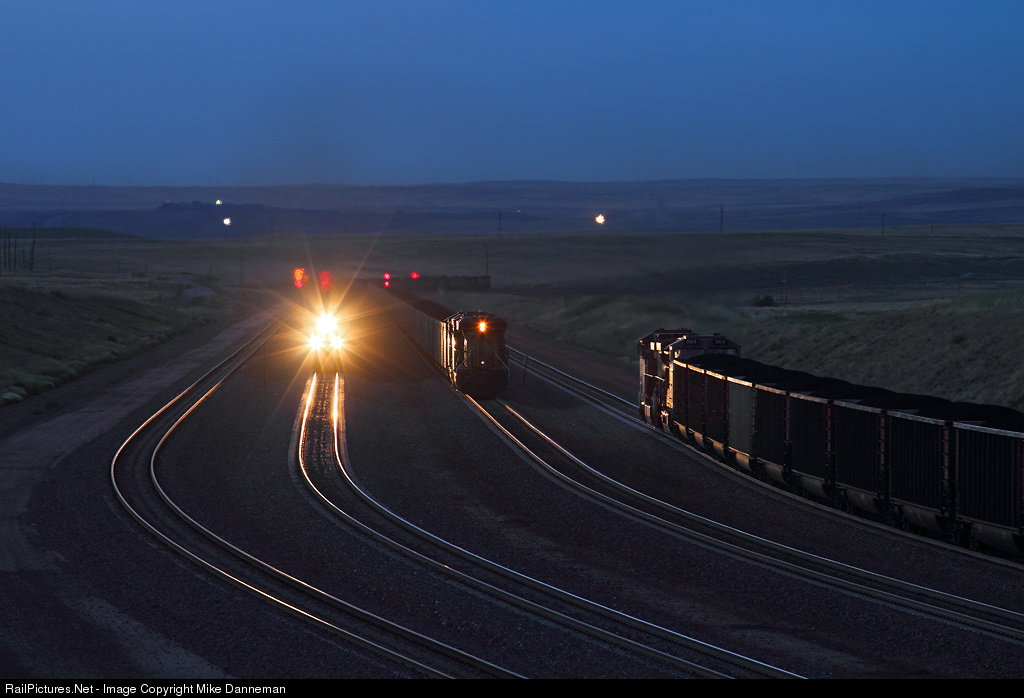 Three Union Pacific coal trains converge on Logan Hill, Wyoming, after sunset at 9:00 p.m. on July 2, 2016. On the right are DPUs of a load that has crested the hill and is headed south. On the next track over are two more DPUs of an empty headed back to a mine to load. Bright headlights of another load climbing the grade is led by SD70ACe No. 8753. A fourth train can be seen dropping down into Antelope Creek Valley in the middle background, its headlights distorted by hot exhaust. Even though Powder River Basin main lines can still be busy, the western-most track in this view is temporarily out of service due to traffic levels.