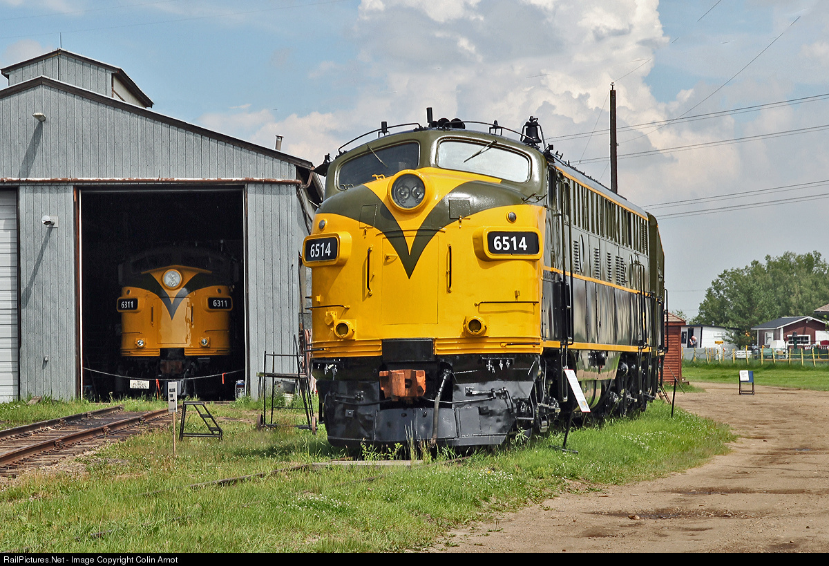 FP9A, CN 6514 was built in 1957. It was transferred to VIA in 1978, then to the Algoma Central route in 1995. It was finally retired in 2001 and then in 2003 donated by CN to the museum. It was seen at the museum for many years in black livery and carrying an "Alberta Railway Museum" logo (photo 442655), now restored to former CN colours. In the shop behind can be seen CN6311, a privately owned unit, also repainted to original CN colours.