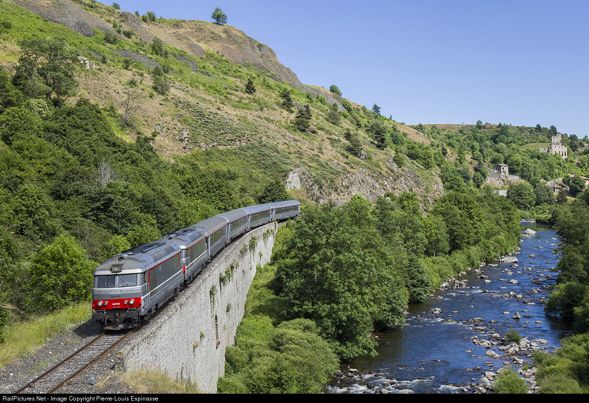 | The Intercity linking Nimes to Clermont-Ferrand is running the Allier Canyon with Jonchères castle in the background. |
