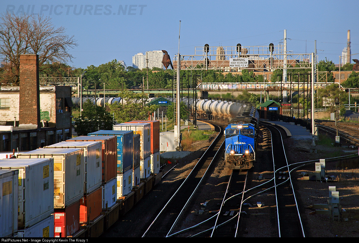 | Norfolk Southern's Conrail heritage unit #8098 heads west into the late evening sun along BNSF Chicago's Subdivision leading an another oil can empty back to North Dakota while the rear end of the Chicago - Denver intermodal is seen strung out along the Lumber Lead on the Ceco side of Cicero Yard. |