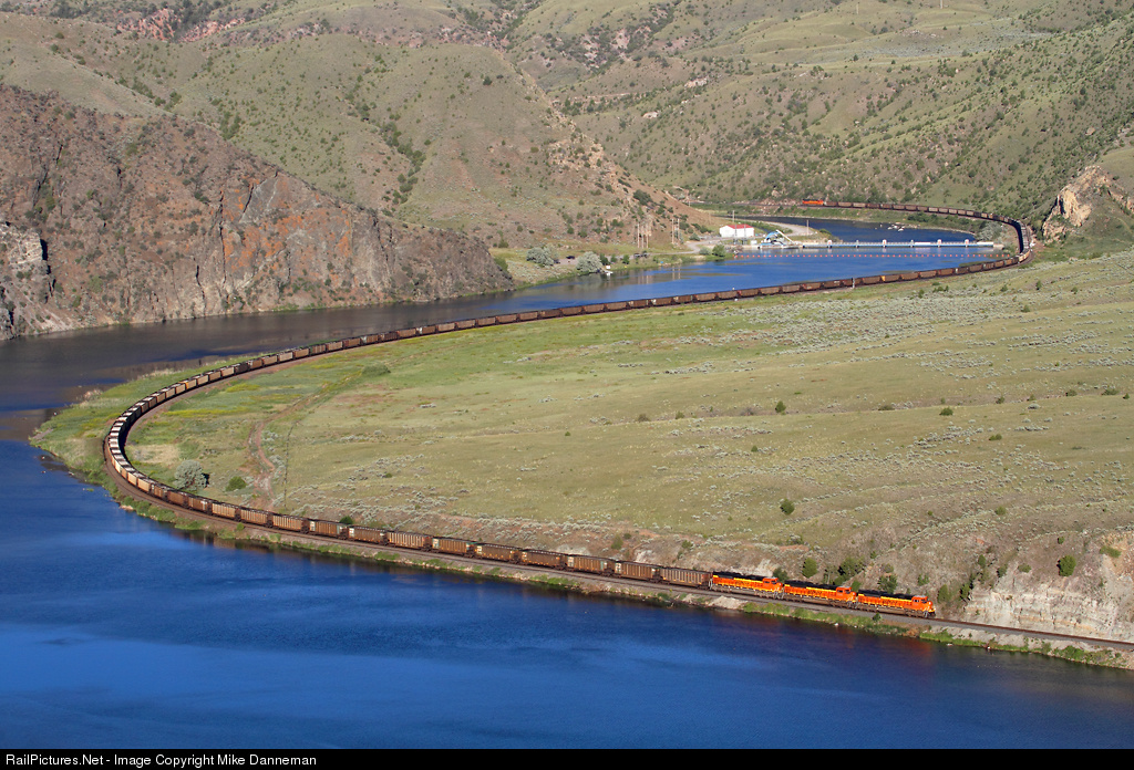 Four ACes On the afternoon of June 25, 2016, an eastbound BNSF coal train snakes along the Missouri River through Lombard Canyon between Toston and Lombard, Montana. Three “elephant-style” EMD SD70ACes are up front, followed by a single ACe pushing on the rear. Below the DPU in the background is Toston Dam.