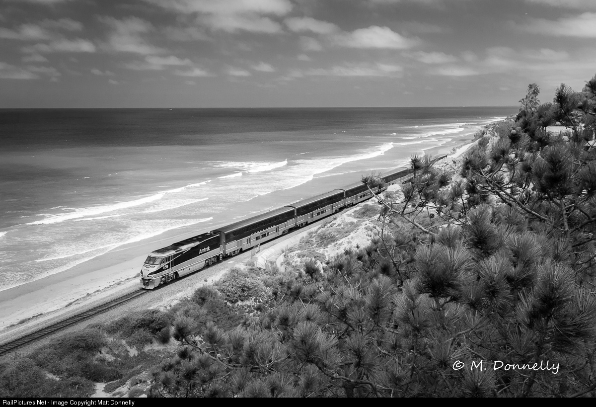 | An Amtrak Pacific Surfliner heads through scenic Southern California, living up to its name. |