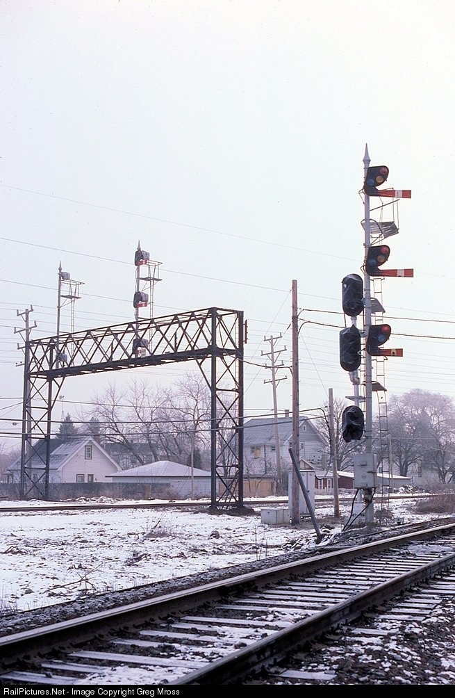 Changing of the guard. A gloomy day is made even gloomier by the presence of new signals at St. Francis, WI. in December of 1986. Soon the semaphores would be no more. This is not the first change at the junction here, as much of the double track, double slip switches, and passenger service is no longer present.