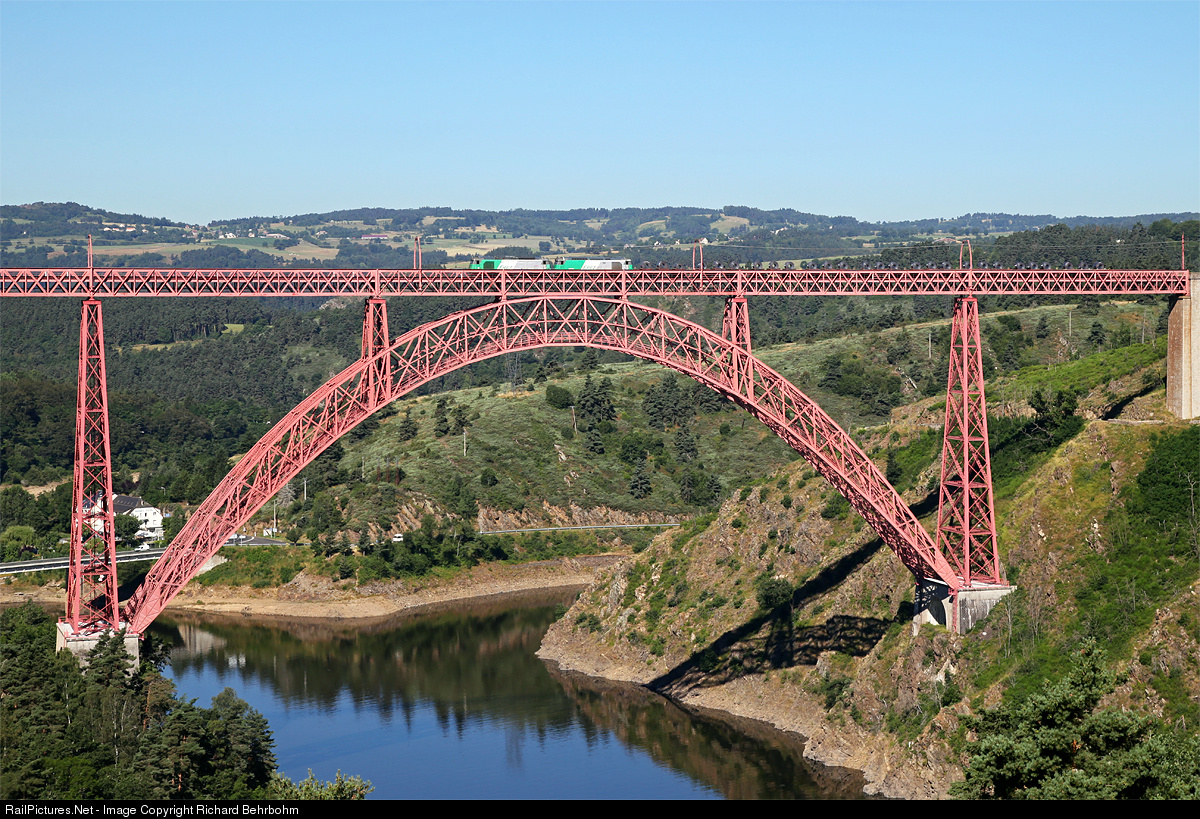 BB 67579 and BB 67563, en route with a freigth train Clermont-Ferrand - Saint-Chély-d'Apcher, are crossing the Viaduct of Garabit. Architect of the viaduct is Gustave Eiffel, total length 565m (1,854 ft), longest span 165 m (541 ft), 124 m (407 ft) high, construction 1882 – 1884.