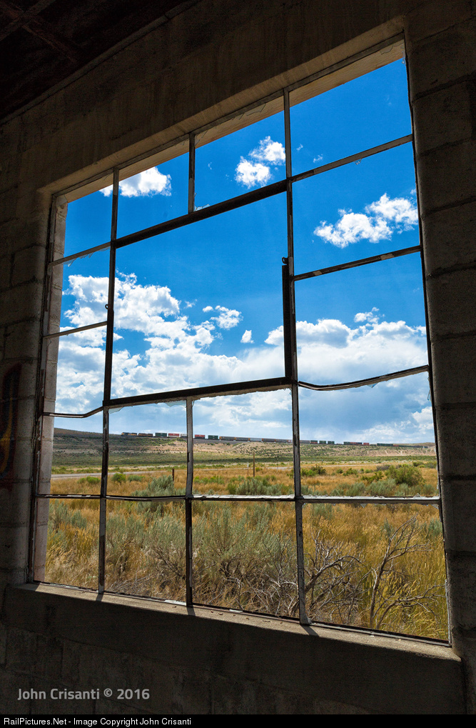 Looking inside an old gas station along WY-HWY 374, an eastbound stack train led by Union Pacific SD70ACe No. 1995 descends Peru Hill near the small town of Jamestown, Wyoming just west of Green River along UP's Evanston Subdivision on July 25, 2016.