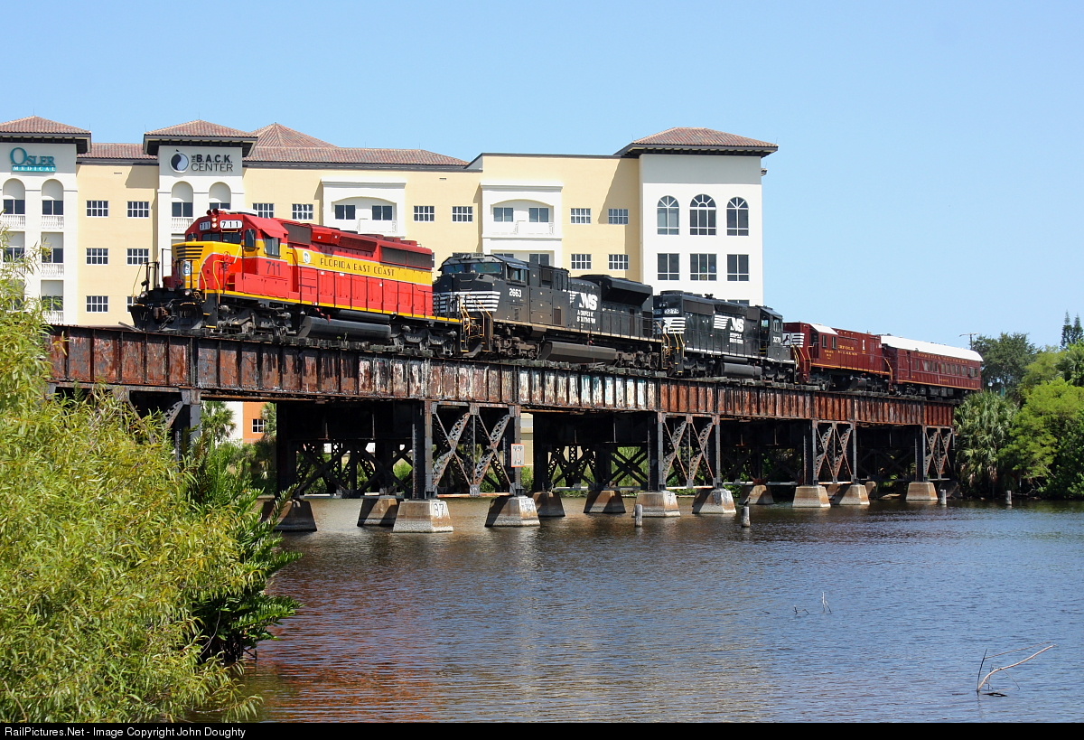 The NS Geometry train, with FEC 711, NS 2663, NS 3279, NS 38 and a test car, heads north towards Jacksonville as it crosses the Crane Creek Bridge in downtown Melbourne. To see a Norfolk Southern pool power unit on the FEC is rare these days, to see two on a FEC train is a real treat.