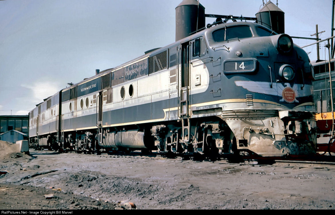 Rio Grande’s Denver roundhouse and shop complex at Burnham are gone now, demolished early in 2016 in the name of progress. But on an afternoon visit back in June, 1962, the photographer encountered Missouri Pacific E7A 14 just off the Colorado Eagle and laying over near the fuel racks. Meanwhile, the chair cars, sleepers and diner were being cleaned and restocked nearby in the coach yards. In an hour or so, engine and train 12 would be united and hauled down to Union Station for a 4:05 departure to Pueblo, Kansas City and St. Louis. The E7A, turned out by EMD in the late 1940s, still bears the original Cerulean blue, Icterine yellow and Isabelline gray scheme created for the MoP by famed industrial designer Raymond Loewy, who was also responsible for the engine’s winged emblem and round portholes. Other road’s E7s had rectangular windows.