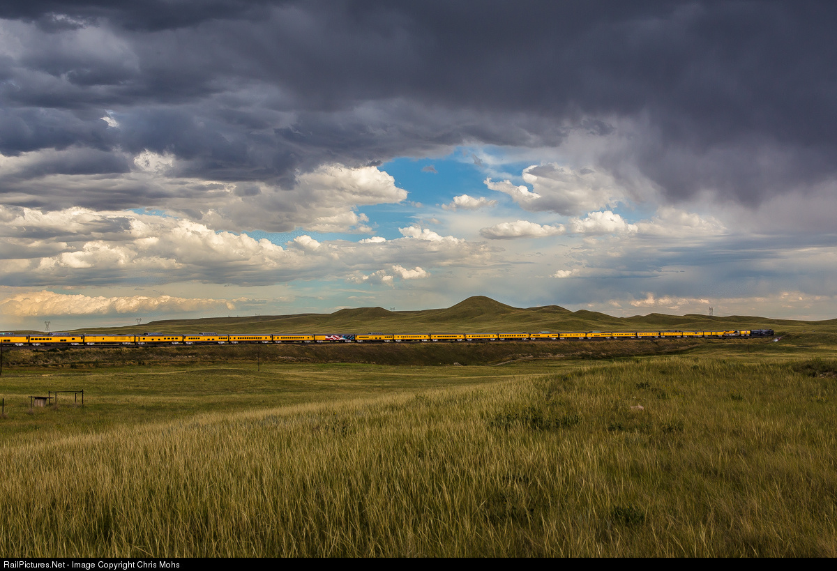 | The Cheyenne Frontier Days Train crosses the Wyoming Prairie under threating sky's on the return trip to Denver Colorado Congratulations to the entire Union Pacific Steam Crew, Union Pacific Railroad, and every one that helped get No. 844 back on the road for all to enjoy. |