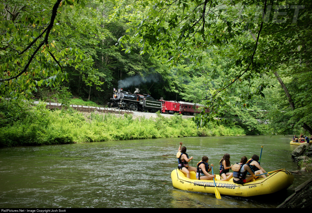 The Great Smoky Mountains Railroad No. 1702 during the engine's first trip into the Nantahala Gorge since 2004.The locomotive was welcomed with warm smiles and waves from the rafters in the Nantahala river. This trip was exactly one week after the locomotive was first scheduled to pull the Nantahala Gorge train, but everyone was excited nonetheless. The engine will be operating on these trips until November when it will be stored for the winter.