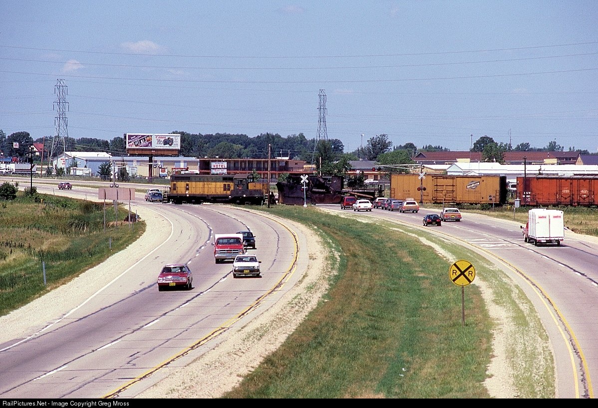 I hope they all stop! CNW 4490 stops 4 lanes of 55 mph traffic on Historic Hwy 41 in Fond Du Lac as it leads a short train westward to Ripon. This line would only last another year before it was abandoned. There were numerous crossings like this on Hwy 41 and they are all gone. Look closely and you will see a Canon camera taking a photo from the other side!