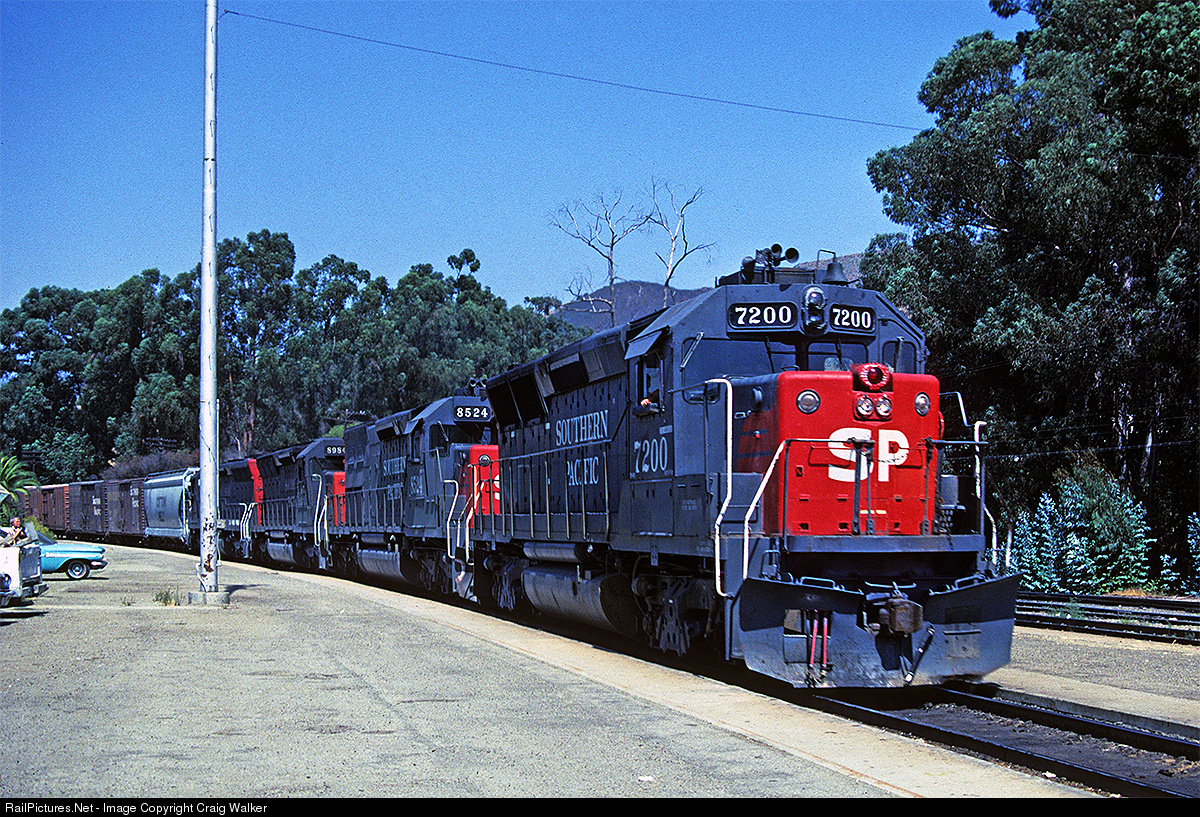 Lots of Flared-Radiators Creeping to a stop in San Luis Obispo is an eastbound Southern Pacific freight, heading down California's coast from the Bay Area to Los Angeles. On the point is SP GP40X 7200, built in February 1978 - but having lost its distinctive "elephant ears" by this September 6, 1981 date. Behind the flared-radiator GP40X are SP SD40T-2 8524, SD45 8984 and another SD45.