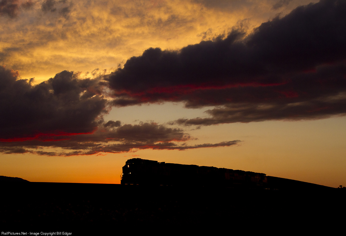 An empty coke train gets underway at Winston, MT after meeting the Helena Local returning from Logan, MT post sunset. The recently set sun still lights the clouds, some of which produced minor thunder showers along the Missouri River valley between Lombard and Helena.