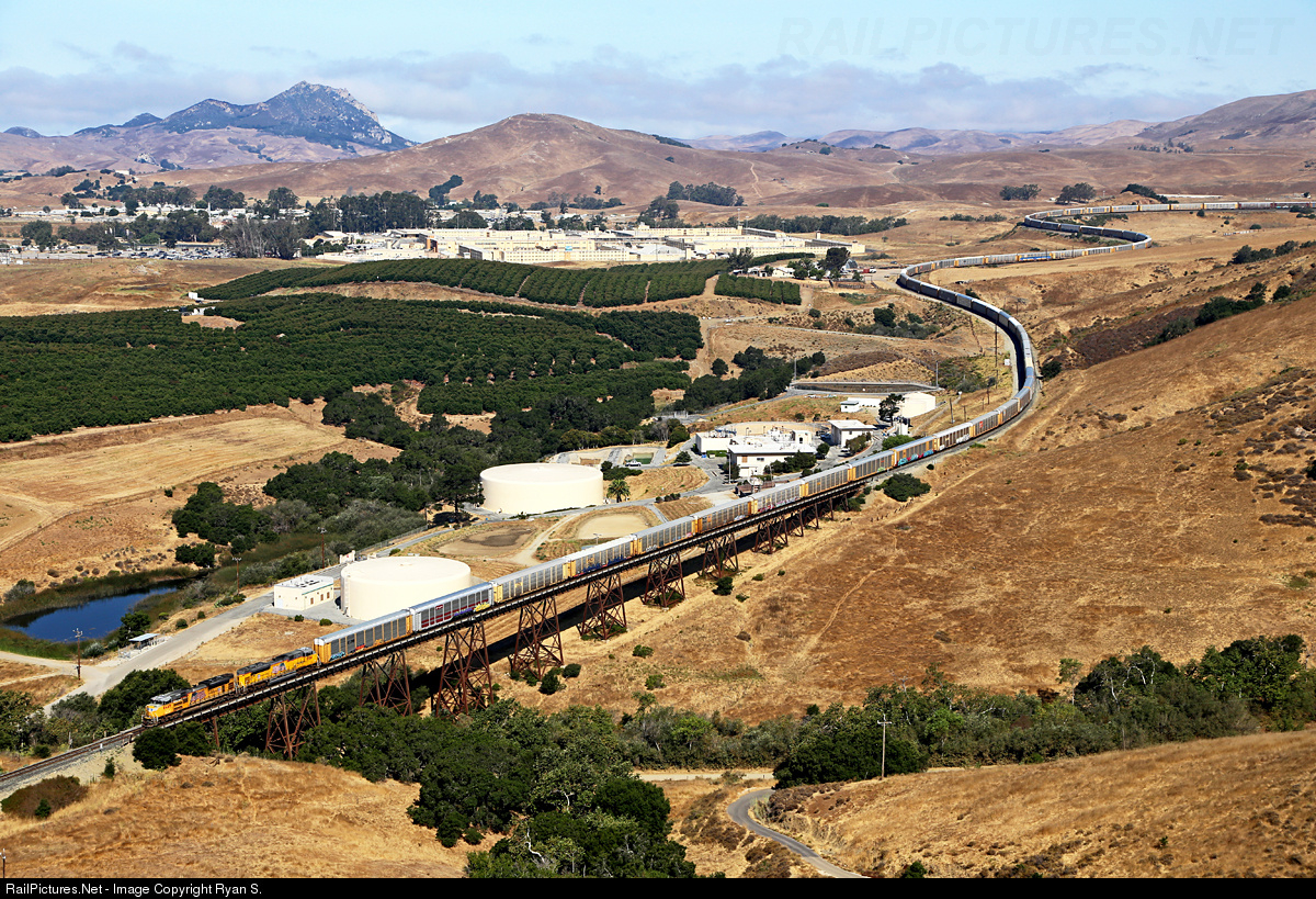 | As the coastal marine layer begins to retreat back towards the Pacific Ocean the morning sun warms the rolling golden hills along California's scenic central coast. Within this picturesque setting the rails of Southern Pacific's famous 'Coast Line' leave the floor of the San Luis Valley to assault the hills on their climb to Santa Margarita, CA. Carefully drifting down the formidable Cuesta Grade and into San Luis Obispo an eastbound Union Pacific auto train slips across Stenner Creek trestle as its train highlights the snake like curves leaving the Goldtree horseshoe. Although not the freight artery it was years ago under the Southern Pacific, the 'coast' still hosts a few of successor Union Pacific's trains per week. |