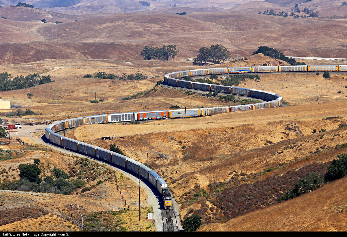 Carefully dropping down into the San Luis Valley an eastbound Union Pacific auto train highlights the serpentine curves on the approach to Stenner Creek, trading distance for elevation in the Coastal Mountains.