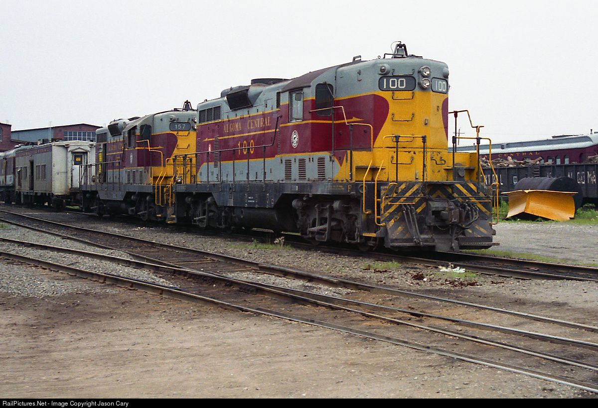 Algoma Central 100 sits in the yard awaiting duty September, 1994. The GP7 was built in 1951, and rebuilt into a GP7L in 1978. It later went to the Wisconsin Central and was scrapped in 2004.