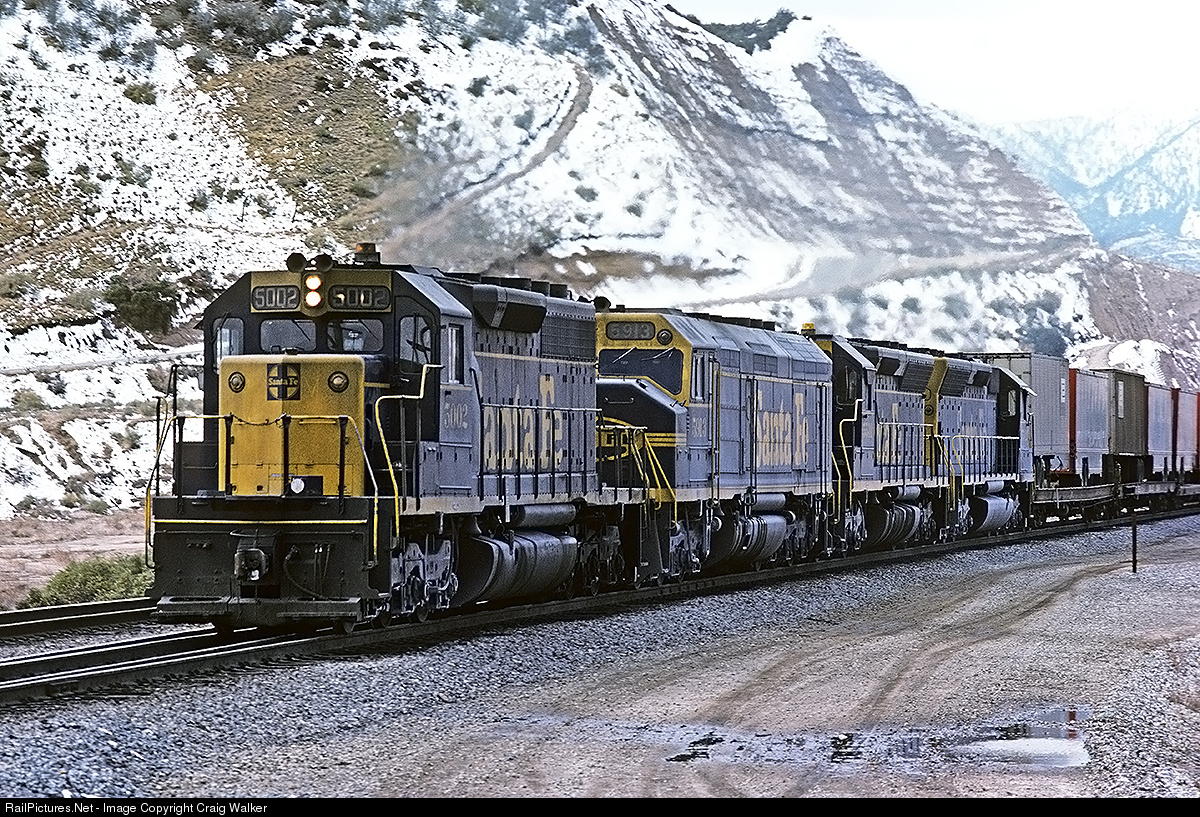 Cresting Cajon Pass on a snowy March 5, 1976, is a Santa Fe eastbound piggyback train. Santa Fe SD40 5002 in on the point, followed by F45 5913 and a pair of SD45s - all still wearing the railroad's "dress blues" scheme that was, by this date, four years out of date.