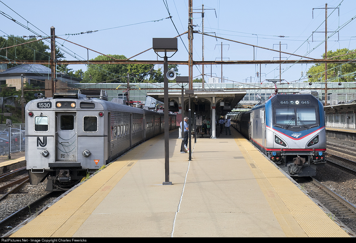 New Jersey Transit and Amtrak trains, both ready to head north to New York City (and on to Boston for the Amtrak) load at the Trenton train station.