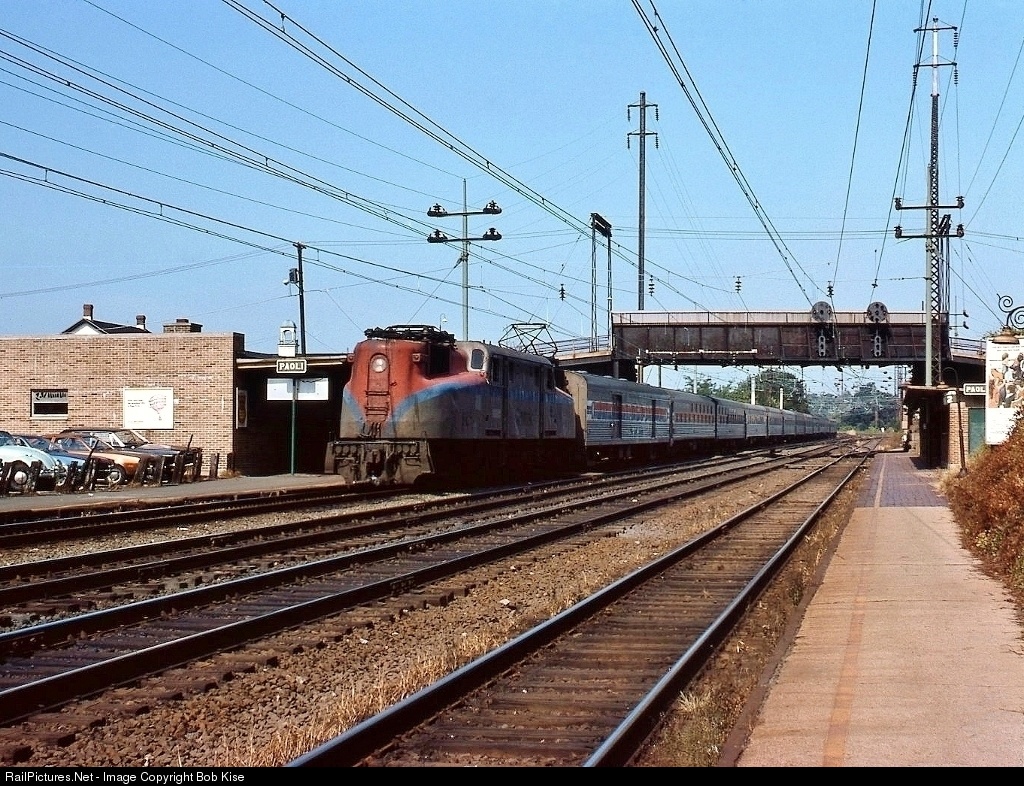 Paoli, 1975- the Broadway Limited eases to a stop on its way from Chicago to New York. Note the two sleepers behind the baggage car. If you want to make the trip today, you hop off the Capitol Limited in Pittsburgh at 5:05 a.m. and catch the all-coach Pennsylvanian to New York, departing at 7:30 a.m. Westbound, you arrive in Pittsburgh at 8:00 p.m. and have nearly a 4-hour wait for the westbound "Capitol." The 1953-built Paoli Station is slated for some improvements. From the Amtrak/PennDOT web page: "The project will include a new center high-level platform, elevators, ramps, a pedestrian overpass, parking lot improvements, ADA improvements to the existing station building, and changes to infrastructure that allow for construction of the center high-level platform. Once complete, this work will bring the Paoli Station into compliance making it accessible for all users."