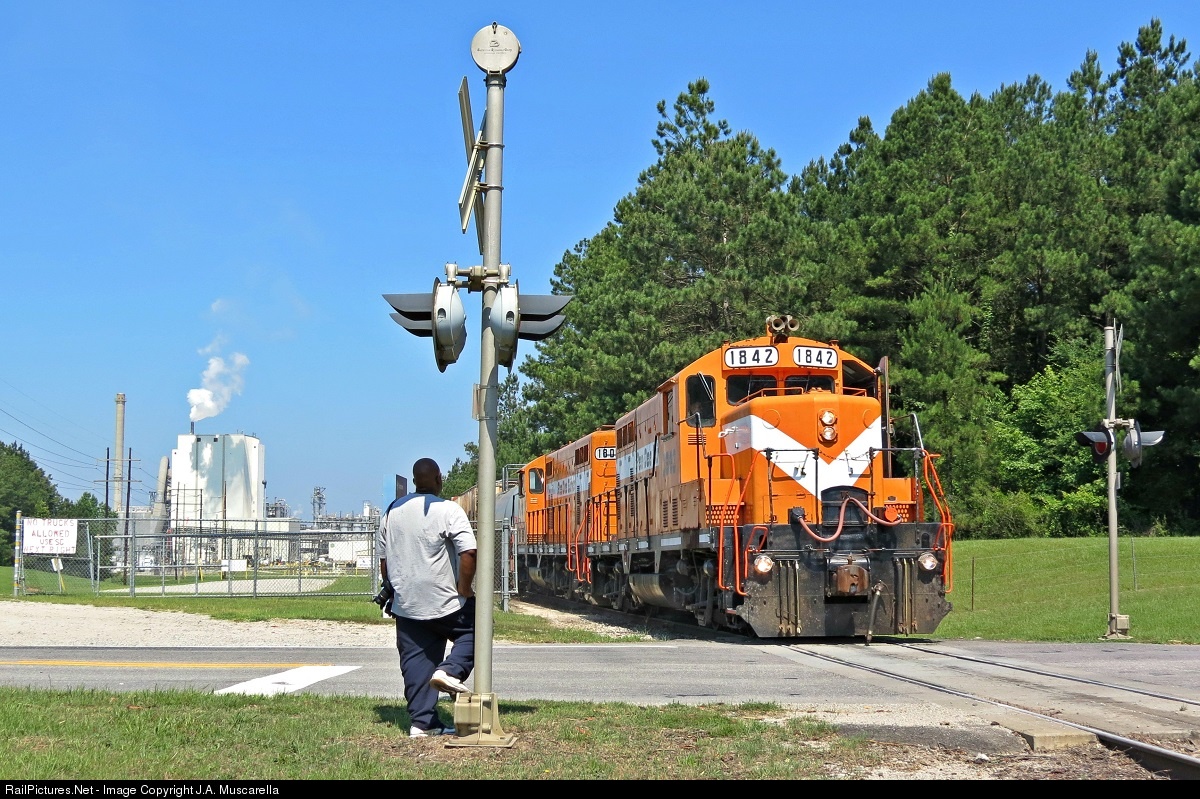 | A Sunday afternoon of work brings the Pee Dee River Railway out of their yard to do switching work at the Domtar Paper Mill. Fellow railpictures.net photographer Reginald McDowell is seen watching the train push back further into the Domtar facility. |