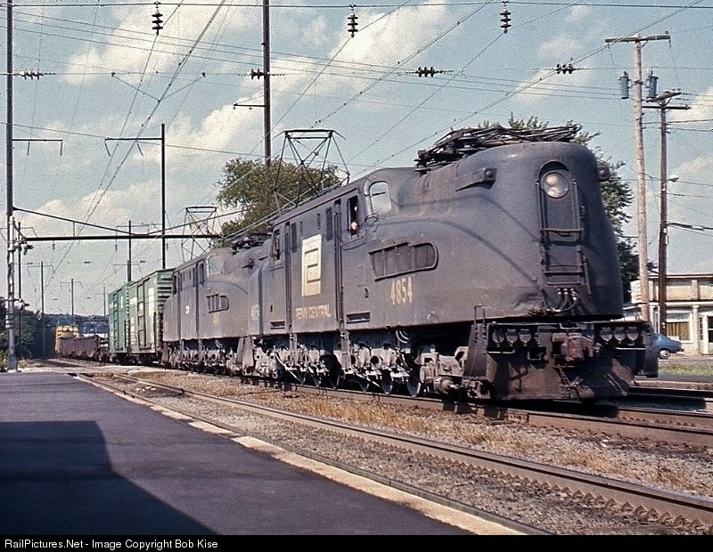 Doubleheaded GG-1s, their trucks white with sand, are leading a southbound manifest to Bayview or Pot Yard. Conrail is only 2 months old, so lead motor No. 4854 is still wearing Penn Central lettering on its flanks. Altoona/Westinghouse manufactured the 4854 in June, 1935, and it was still going strong here, 41 years later.