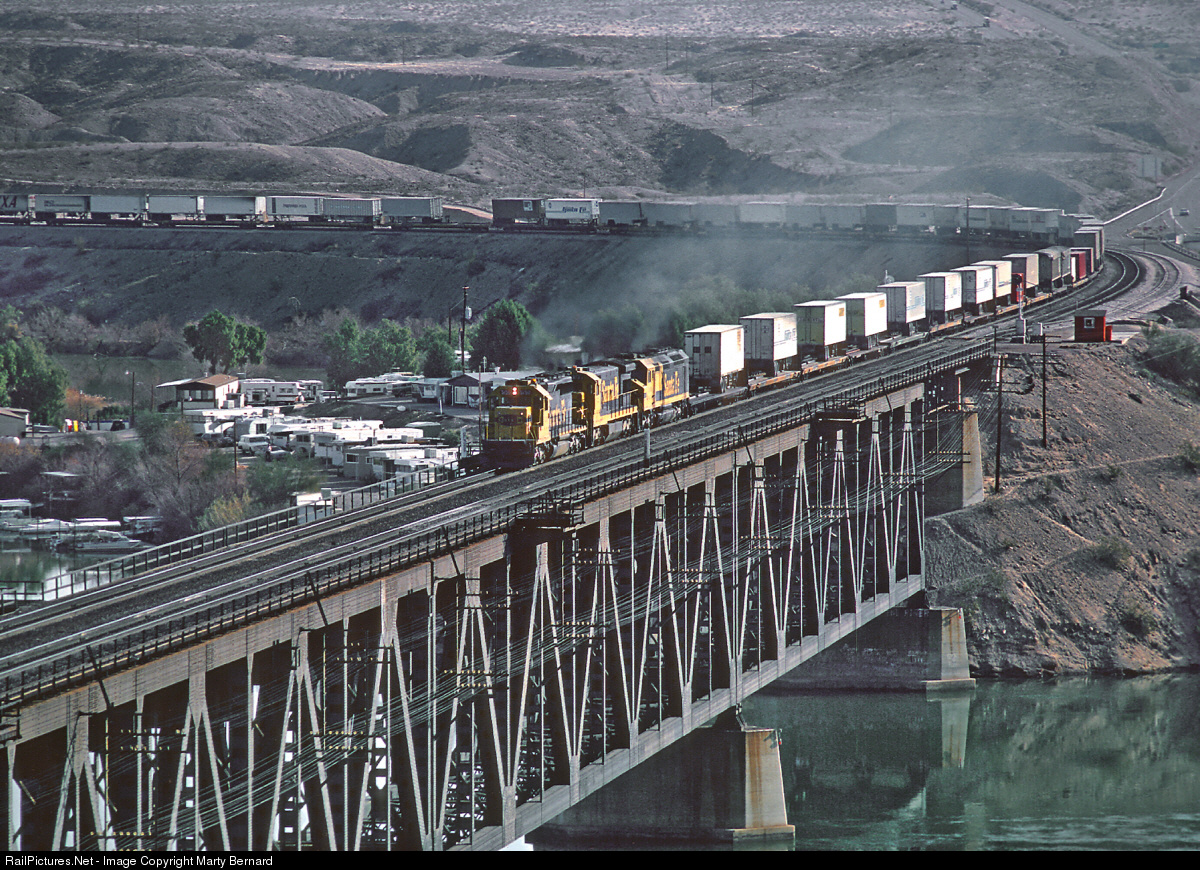 A westbound on the Colorado River Bridge at the Arizona/California border in January 1983. The closest town is Topock, AZ. In maybe 20 minutes the train will be in Needles, CA. A Roger Puta Photograph