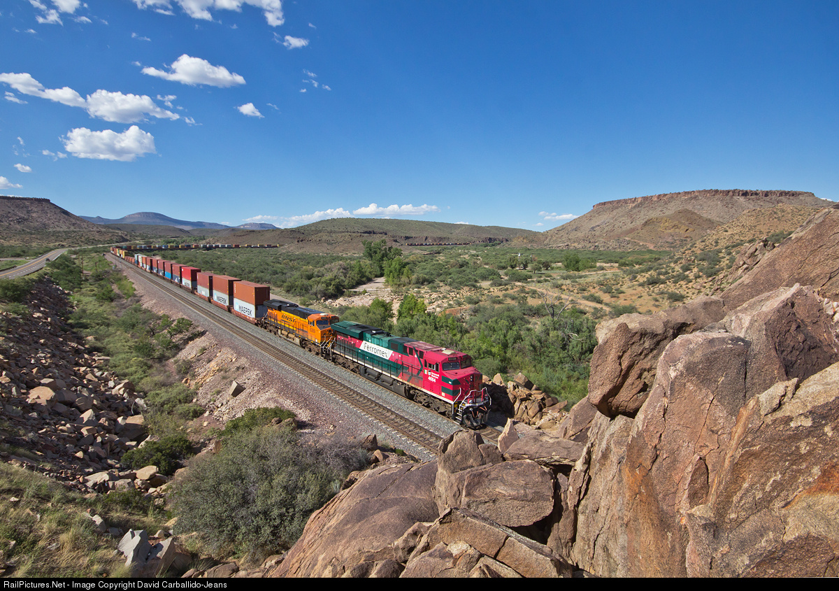 The two DPUs on an eastbound Los Angeles Harbor (Pier 400), CA to Logistic Park Chicago, IL stack train slowly works up the grade into Crozier Canyon on a warm, August, evening. Thrown into the mix of the power is a Ferromex locomotive. At some point, this GE locomotive crossed the border, ended up on the BNSF rail system, and brought to the LA area. Now, FXE 4684 will have a short visit in U.S until it is delivered back to Ferromex at onr of the railroad border interchanges in Texas.