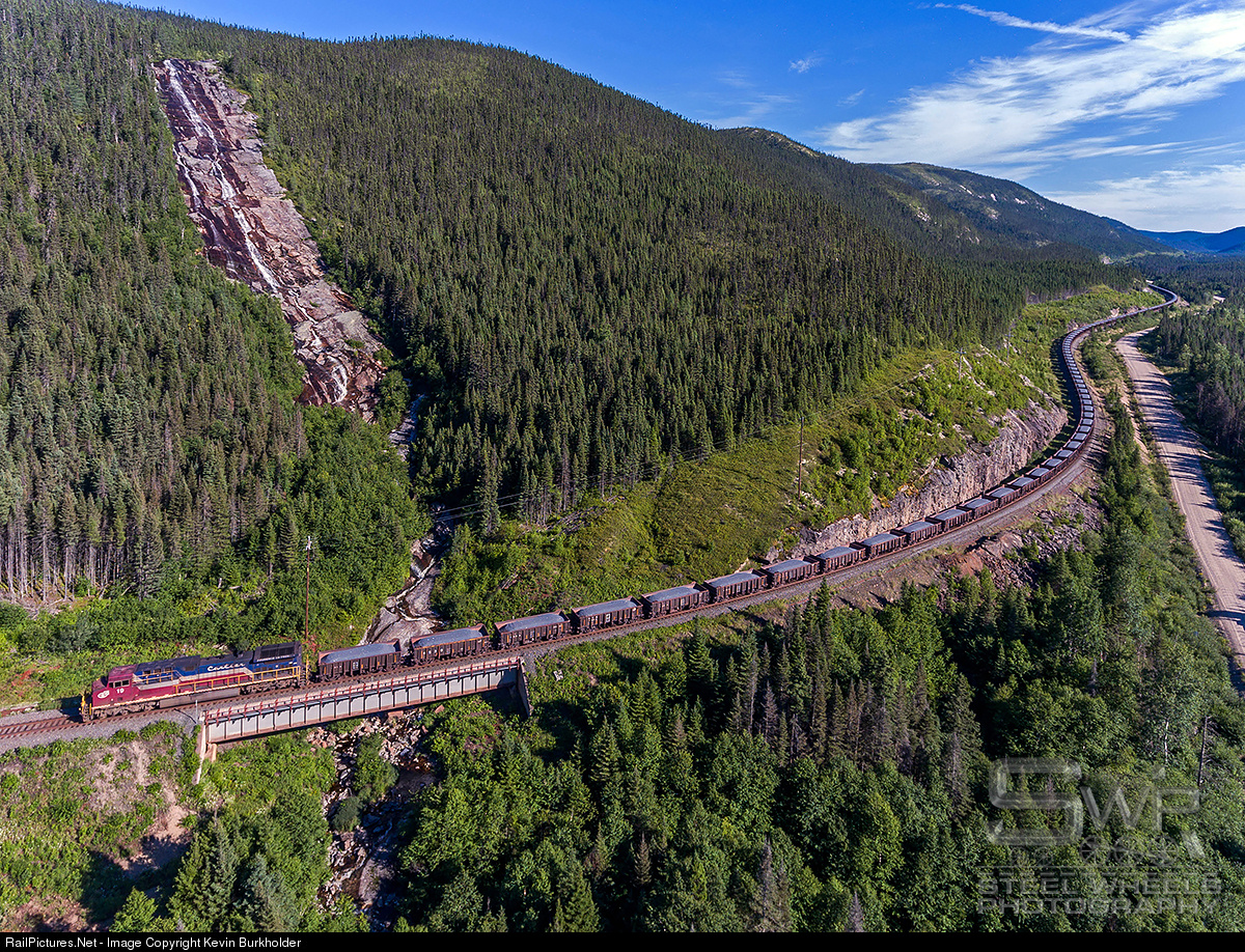 The rear end DPU of ArcelorMittal Quebec Cartier Mining Corporation southbound ore train CV-818-T is seen enroute to Port Cartier from Mount Wright with Cartier AC4400CW 19. Train is seen crossing bridge 43 in front of a high waterfall that is a seasonal tributary for the Riviere MacDonald.