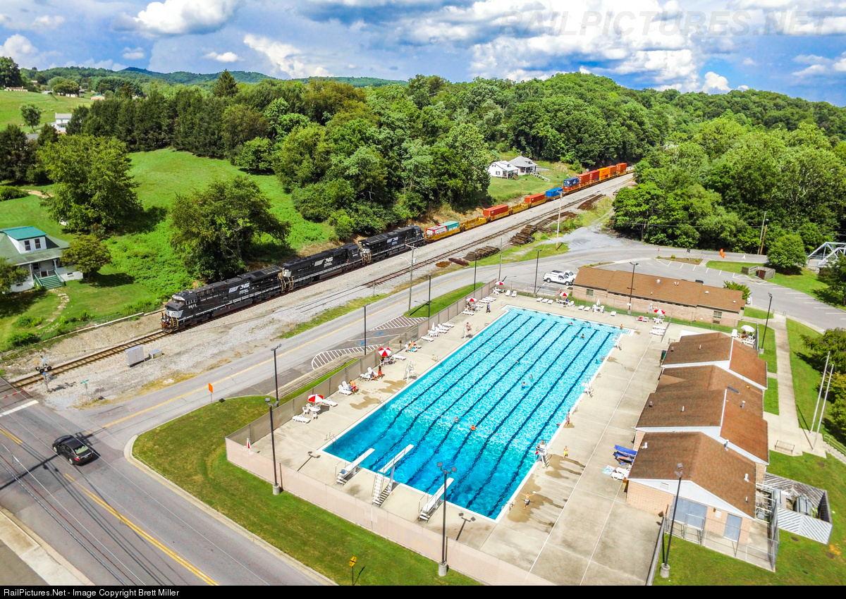 With temperatures reaching 100 degrees ferinheight, children of all ages are taking a cool dive in the town pool as the westbound intermodal 22A rolls by with a new ET44AC Tier 4 on the head end.