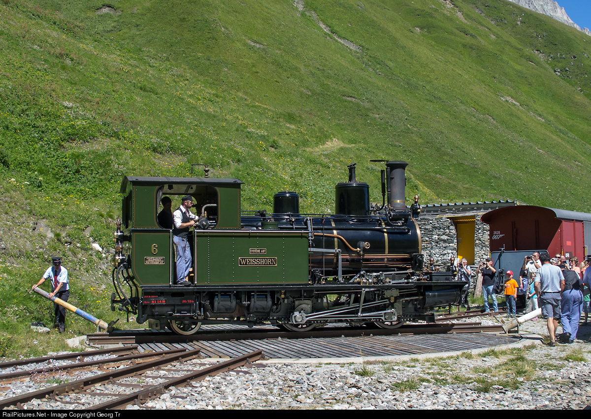Cogwheel steam locomotive HG 2/3 # 6 "Weisshorn" of the Dampfbahn Furka Bergstrecke (DFB) is beeing turned on the turntable in Furka station, 2160 meter a.s.l. This 0-4-2 coal fired locomotive was built in 1902 by SLM Winterthur for the Visp-Zermatt Bahn (VZ). On the Furka pass line, the locomotive has to go down the 11.0 % ramps chimney mountain side always (water level in the boiler!). The VZ is all level or going up towards Zermatt and so she had never to be turned there.
