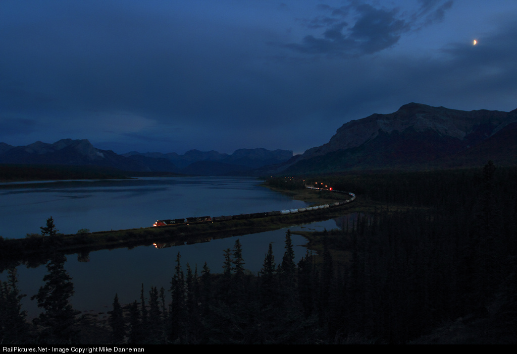 Nightfall at Swan Landing As a waxing moon makes a showing through thinning evening clouds, nighttime is descending on Canadian National’s main line at Swan Landing, Alberta. Brilliant pink tones in the clouds seen at sunset have disappeared following a setting sun, with the scenery now taking on azure colors of the blue hour. The lights of Swan Landing blink on, as does the red signals for the siding. It’s a few minutes before 10 p.m. as an eastbound freight shatters the silence as it rounds Robertson’s Curve on a waning August 9, 2016.
